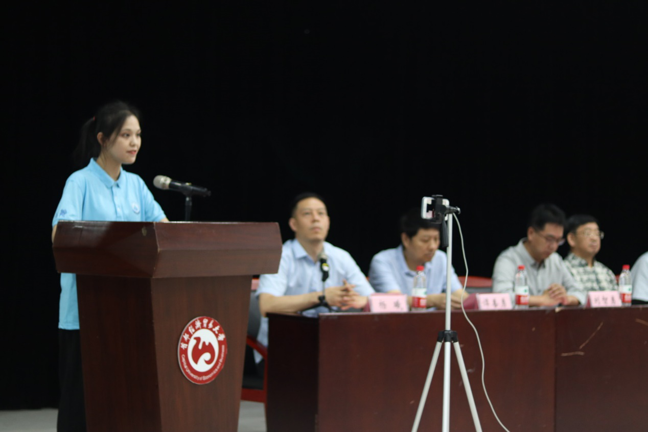 周润湫作为2021级新生代表致辞。她首先提到了进校以来感受到的温暖与感动,接着提出了自己对大学的规划与期望。她希望大家可以快速融入大学校园,快速进入学习状态,对社会时代抱有感恩之心,在专业领域有所建树。此外,她还提出应当规范自己的言行,注重培养健康的人格,积极发扬我校“崇德尚能,经世济民”的理念。