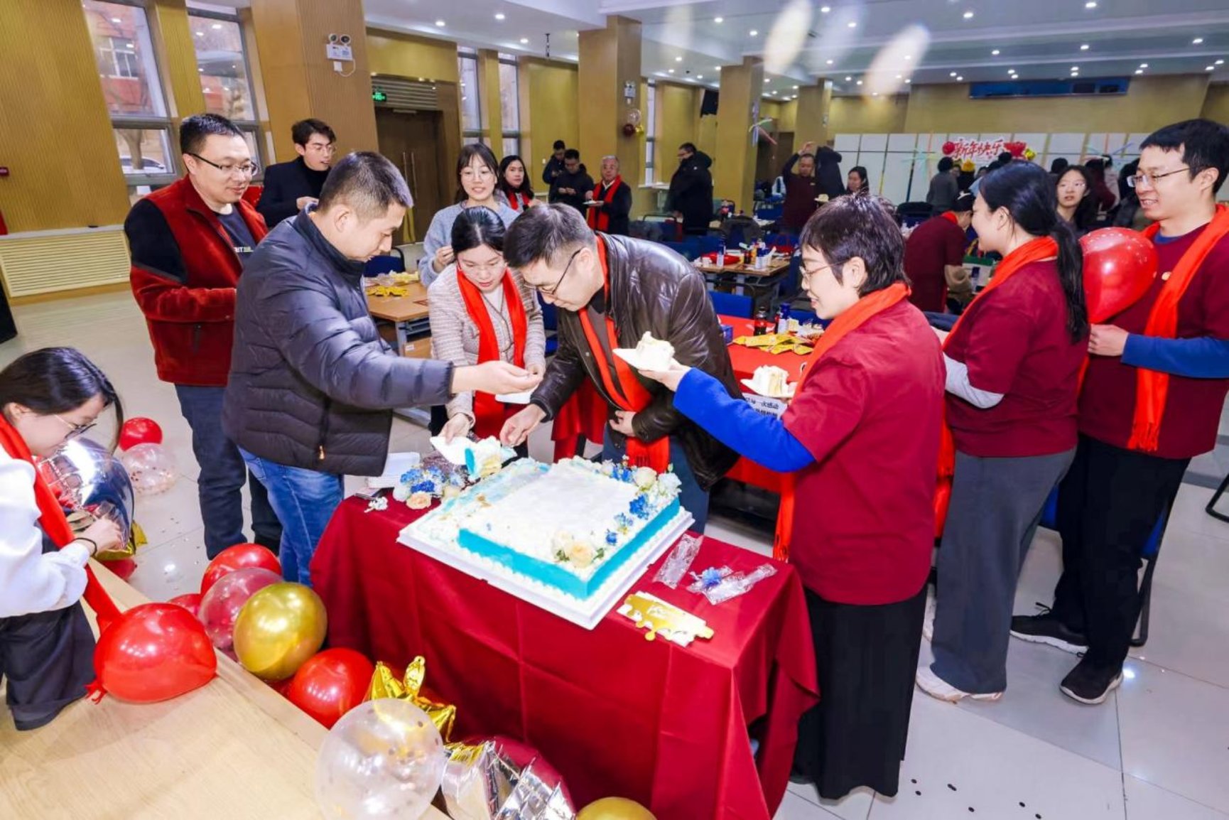 随后,温馨的切蛋糕环节如期而至。在《相亲相爱》的温暖伴奏下,印有 “廿载同心,马到城公” 字样的纪念蛋糕被推上舞台,学院领导与教师代表共同切开蛋糕,分享甜蜜与喜悦,象征着全院上下同心同德、携手共进的深厚情谊。全体人员共同合影留念,定格下这一温馨团圆的美好时刻。