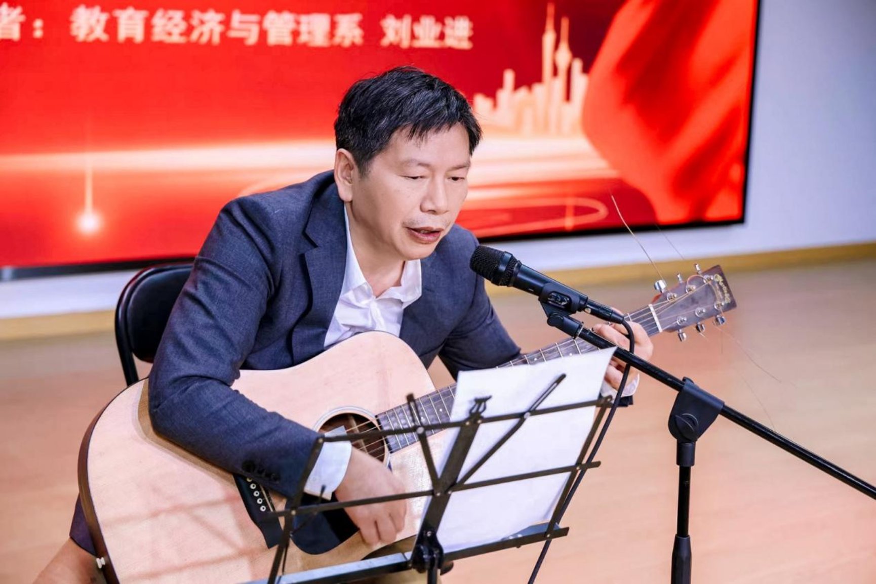 教育经济与管理系刘业进老师的吉他弹唱《你看你看月亮的脸》,深情流露,温柔怀旧的旋律勾起青春记忆。
