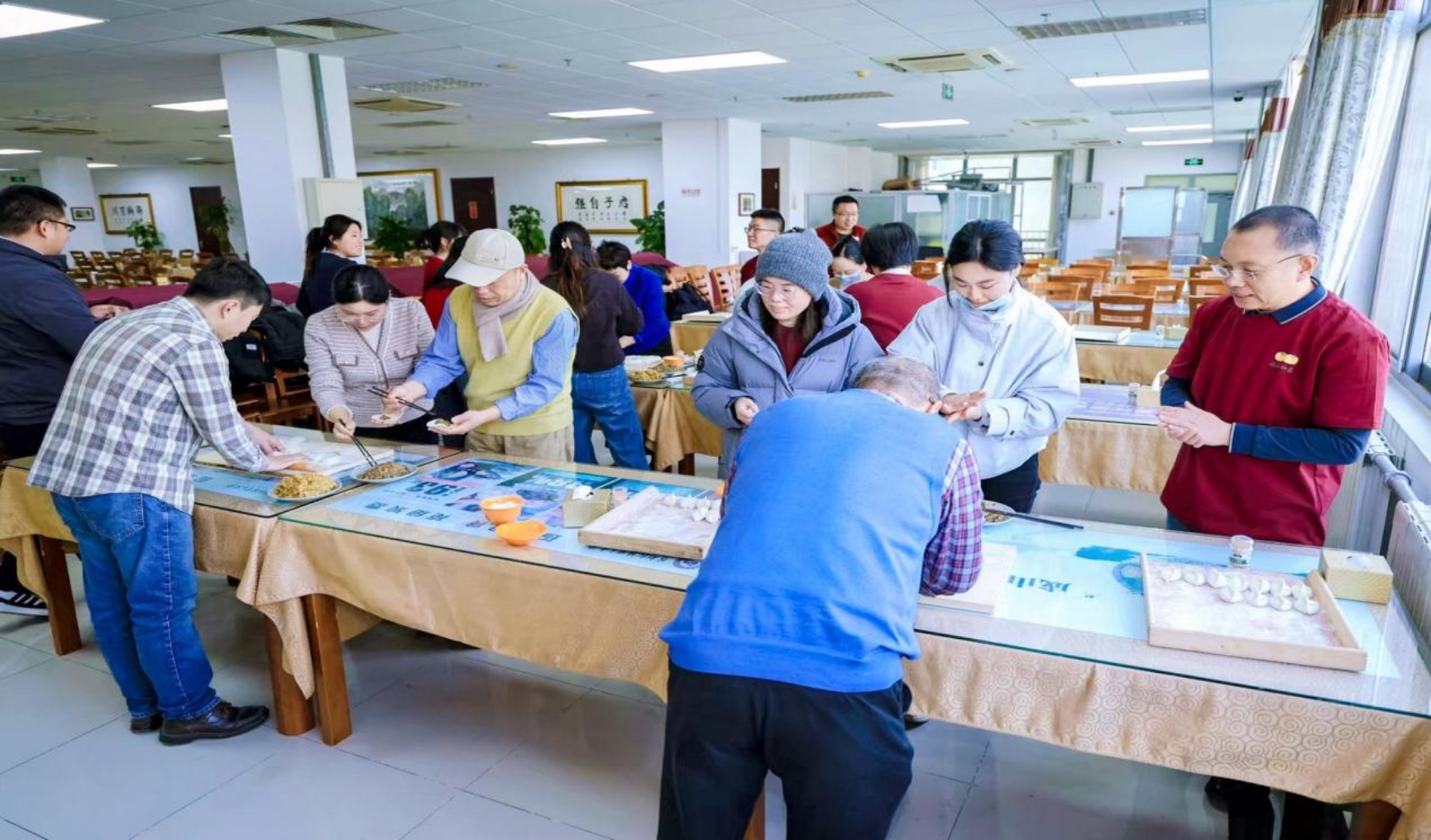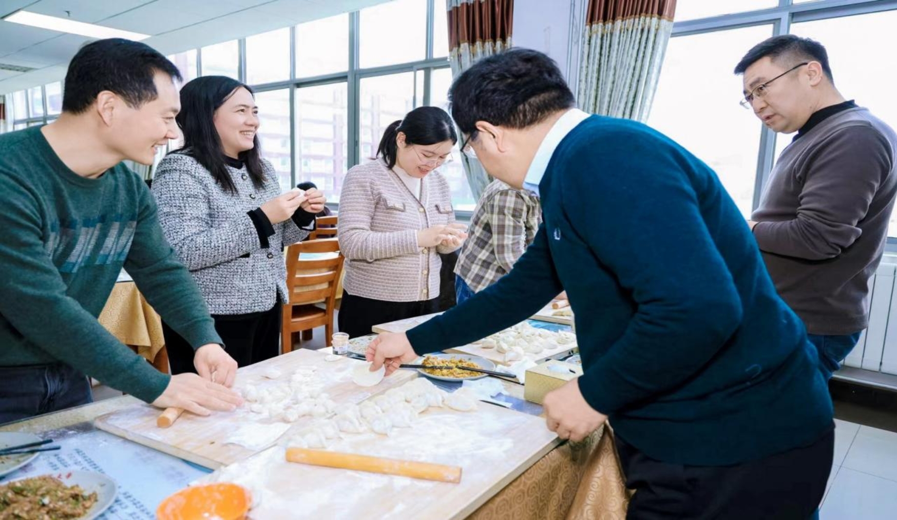 上午10时,第二餐厅二层教工食堂暖意融融,老师们自发分组、分工协作,揉面、擀皮、包馅、捏合,动作娴熟默契十足。大家一边忙碌一边畅谈工作与生活,分享过去一年的收获与感悟,温馨的话语与面团的清香交织,让教工食堂充满了“家”的温暖。