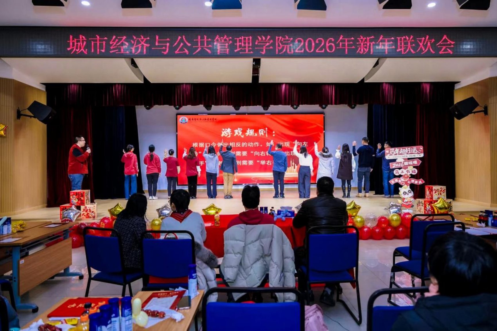 互动环节趣味盎然,为联欢会增添了浓浓的欢乐气息。主持人带领大家开展《正话反做》《马年猜猜乐》等小游戏,老师们踊跃参与,时而整齐划一、时而滑稽可爱,台上台下笑声不断。