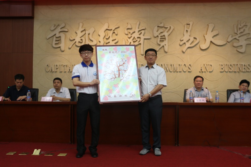 2016级公共管理2班本科生吕思远接受在校生赠书后,代表新生做了精彩发言。不仅表达初入大学校园的喜悦之情以及对大学生活的美好向往,也代表新生们表达绝不浪费一天光阴,努力提升自己的能力的决心。然后吕思远代表全体新生向学院赠送了二百余名新生都参与制作,花费一天时间精心准备的“城”长“知”树。用指纹和心愿卡描绘而成的“城”长“知”树,象征着所有新生心手相连,在城院的这片沃土上用心成长,努力结出知识的果实。今年正值校庆60周年,很多新生借此机会表达了对母校的美好祝福,礼物的右下角也铭刻了校庆60周年的特别标识。学院院长张国山代表学院接受了新生的这份美好的心意。