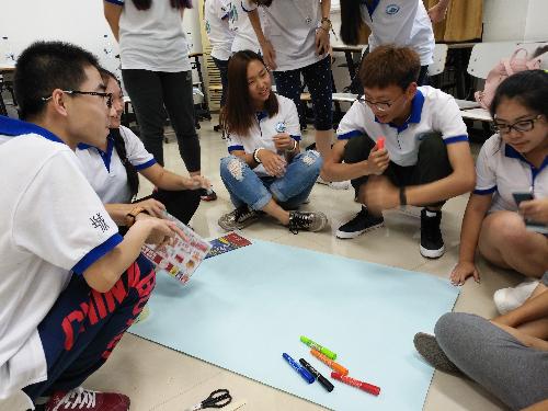 在“人名串串烧”和“班级大点名”暖场活动结束后,班级成员之间便有了初步的了解,不仅熟知了对方的名字,也了解了彼此的爱好和特点。以此为基础,各班分成四队开始名为“星光大道”的建队活动。要求各组在20分钟内选出队长、队歌、队训,绘制队旗,并围绕“自由女神”、“超人”、“葫芦娃”等主题以报纸为素材为队长设计一套时装。时间结束后,各组依次进行比拼。这个项目不仅考验了同学们的分工意识和创新动手能力,也使各位同学也在一片欢乐有趣的气氛中对彼此的了解更进了一步。