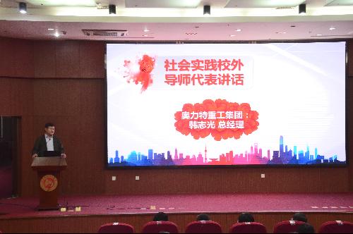 我校2005级校友、社会实践校外导师代表、奥力特重工集团总经理韩志光发表感言。他结合个人经历表达了社会实践对学生的影响。他认为:社会实践是持续学习、终身学习的一部分,学习力就是生产力,要想有生产力,就要持续学习。他鼓励首经贸学子更多向社会、向实践学习。