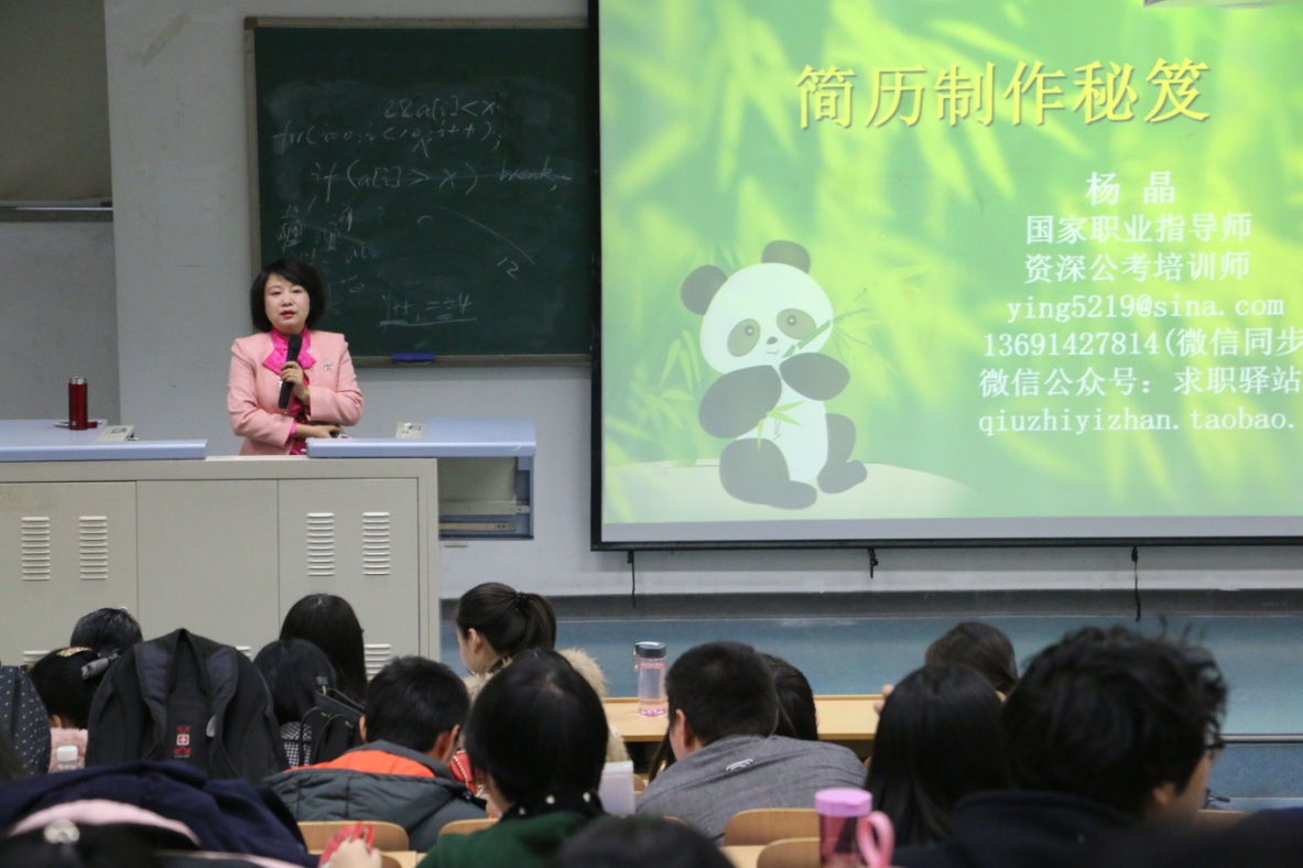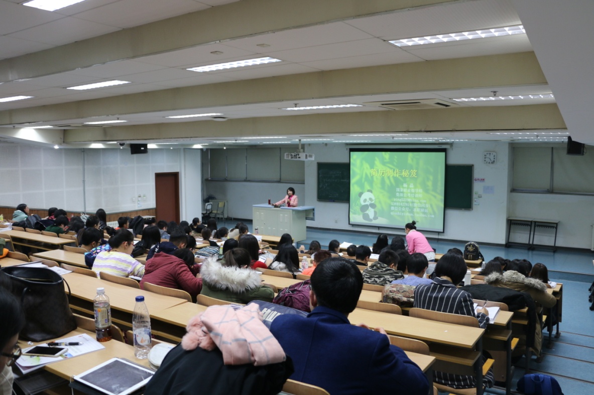在随后进行的培训讲座上,杨晶老师对毕业生们的简历制作进行了详细讲解。她首先告知了毕业生何为无效简历,说明简历制作的目的,并详细介绍了如何制作一份吸引招聘主管的简历——广告模式。其中包括“广告”中的三个要素,即对谁说——人:HR经理;说什么——内容:你与职位相匹配的能力、经历、性格和爱好;怎么说——形式:HR经理最方便的形式。接着,杨晶老师分别从毕业生角度及HR经理角度分析了简历看点,提醒毕业生们根据不同岗位写出与之相匹配的看点。随后又讲解了简历中应包含的信息以及如何书写这些信息的具体内容的方法,其中她用具体的学生例子为毕业生们讲解如何写出一份吸引人眼球的个人简历。此外,他还充分结合时事,比如“一带一路”等发展大背景,为应届毕业生指出就业发展前景。在讲座的最后,杨晶老师向毕业生们讲述了投递简历过程中的注意事项,并建议求职者对自己心仪的工作进行大胆尝试、主动出击,为求职者增加求职成功率。