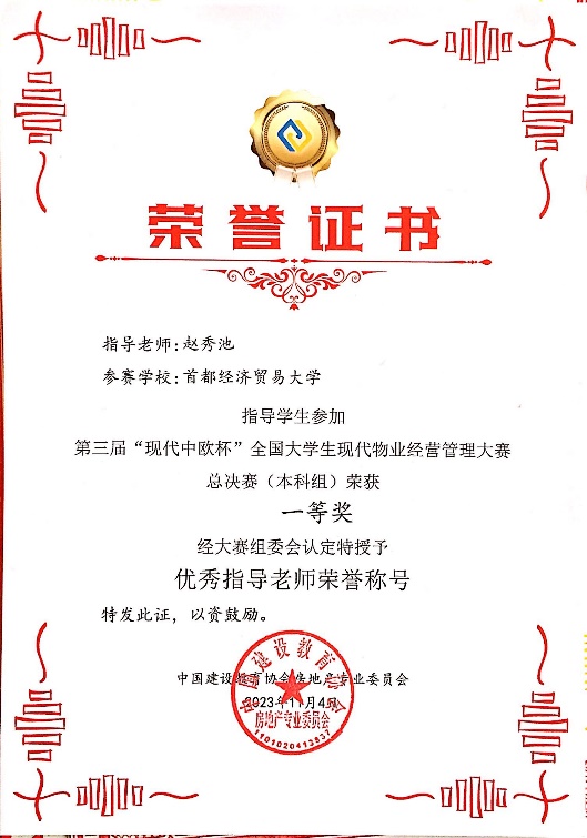 2023年11月4日,第三届“现代中欧杯全国大学生现代物业经营管理大赛”全国总决赛在广东建设职业技术学院清远校区举行。大赛由中国建设教育协会指导、中国建设教育协会房地产专业委员会主办、广东建设职业技术学院和北京现代中欧软件开发有限公司联合承办。全国50所高校109支队伍参加了全国总决赛。比赛全程在计算机上模拟开展,本次大赛秉承“以赛促学、以赛促教、以赛促改、以赛促建”的宗旨,希望通过大赛提高大学生现代物业经营管理能力,培养高素质的物业管理人才,激发大学生的专业兴趣,提高大学生的实践能力,推动我国物业管理行业发展。经过激烈角逐,学院团队获得2个全国一等奖、1个二等奖,赵秀池教授获得了优秀指导教师。