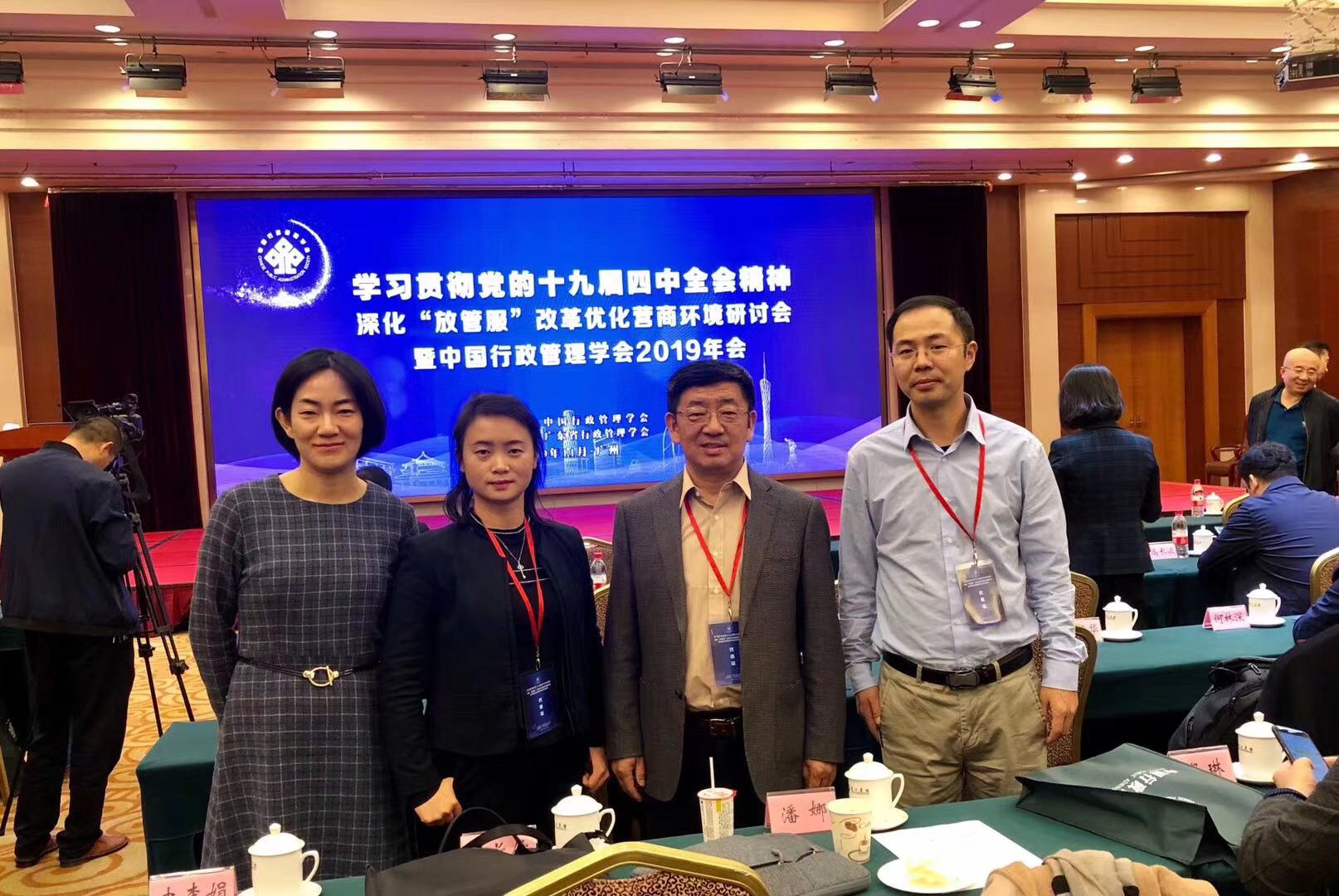 11月29日,“学习贯彻十九届四中全会精神深化‘放管服’改革优化营商环境”研讨会暨中国行政管理学会2019年会在广州市隆重召开。广东省人民政府副省长张虎,中国行政管理学会会长、全国人大常委、全国人大社会建设委员会副主任委员江小涓,中国行政管理学会原荣誉会长、行政管理学奠基人夏书章教授出席会议,来自学术界和实务部门的近三百名专家学者进行了研讨交流。我校城市学院张国山院长带领行政管理系潘娜、王蕾、闫志刚三位教师参加了会议。 本次年会为深入学习贯彻四中全会精神,聚焦“政府治理与‘放管服’改革”“...