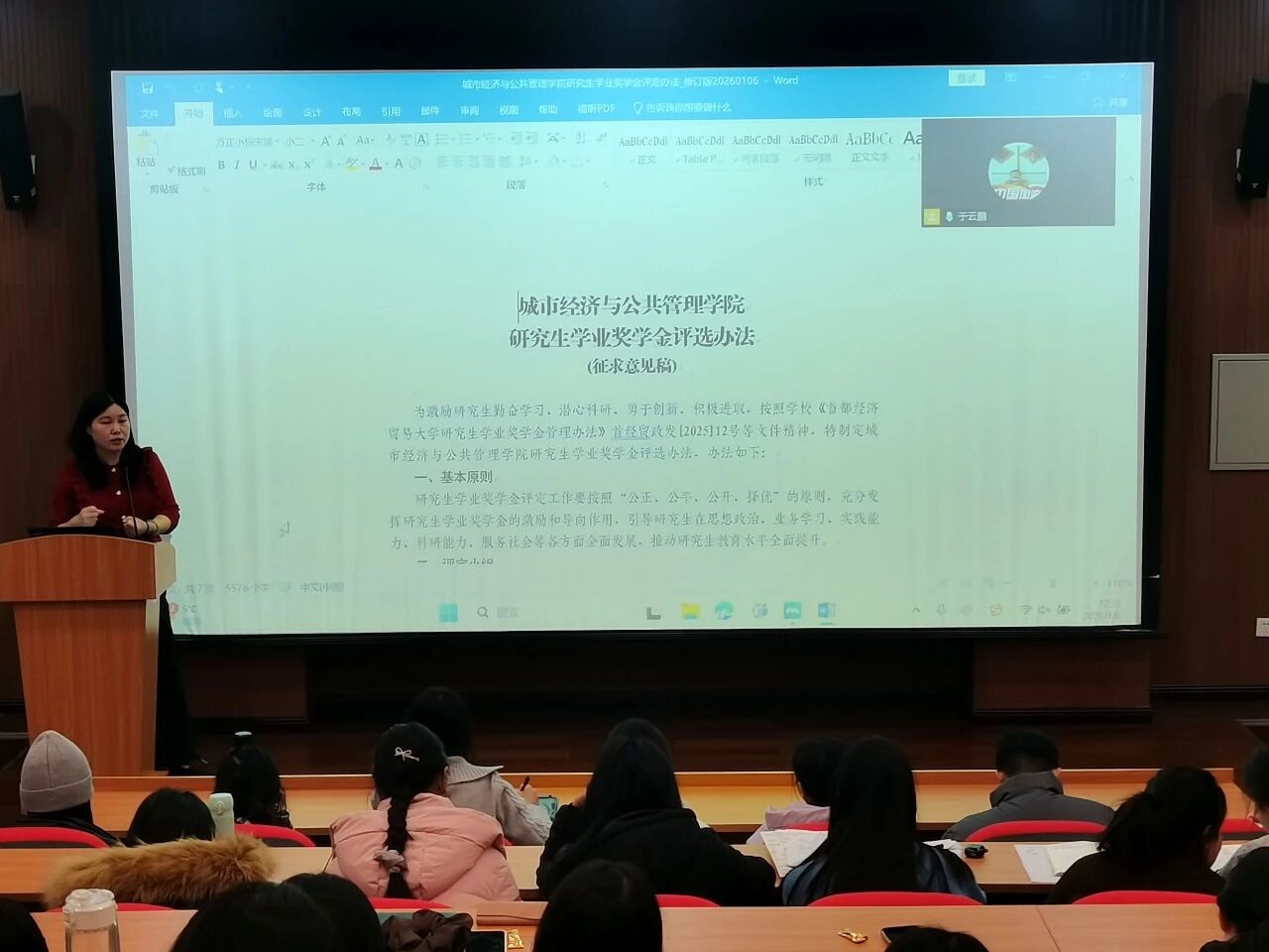 为进一步强化学院研究生工作,1月6日下午,朱古力av 召开全体研究生工作会,学院党委副书记张莹,2024级、2025级全体学术硕士、全体博士参加,大会由专职辅导员郝玙璠主持。 会上,张莹就学生道德和行为规范、诚信考试和学术道德、假期安全、防范电信诈骗等工作做了重点提示;详细解读了学院新修订的学业奖学金评定办法。郝玙璠对新启用的参评人员指标自测表使用方法和注意事项进行了说明。