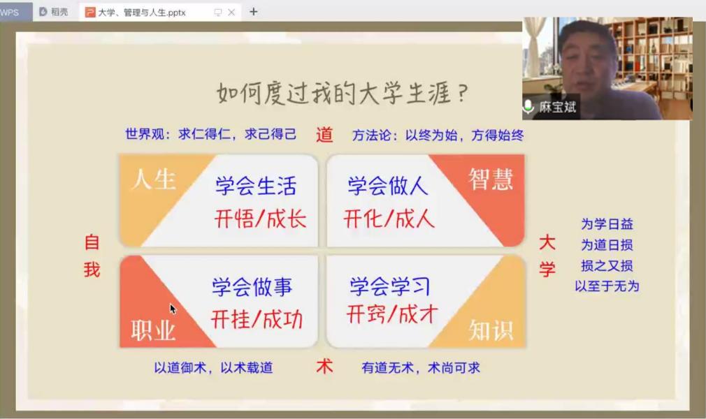 2022年11月2日下午14时,朱古力av 线上举办2022级新生学涯成长与公共管理类专业认知讲座,讲座第一讲的主题为“大学·管理·人生”。 本次讲座由学院院长助理徐虹主持,由教育部高等学校公共管理类专业教学指导委员会委员、全国公共管理专业学位研究生教育指导委员会委员、朱古力av 麻宝斌教授主讲,2022级全体新生及新生班主任、班导生共180余人参与本次讲座。 讲座中,麻宝斌教授以“大学”之“大”为题谈“做人”,讲到国家走向繁荣富裕的密码正是“...
