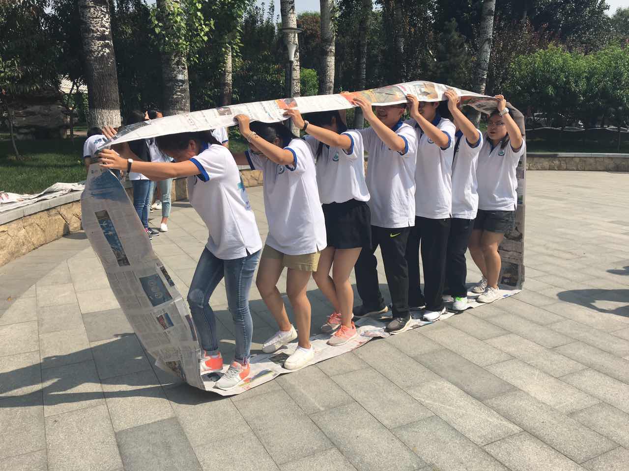 在“人名串串烧”和“班级大点名”暖场活动结束后,班级成员之间便有了初步的了解,不仅熟知了对方的名字,也了解了彼此的爱好和特点。以此为基础,各班分成四队开始名为“星光大道”的建队活动。要求各组在20分钟内选出队长、队歌、队训,绘制队旗,并围绕“自由女神”、“超人”、“葫芦娃”等主题以报纸为素材为队长设计一套时装。时间结束后,各组依次进行比拼。这个项目不仅考验了同学们的分工意识和创新动手能力,也使各位同学也在一片欢乐有趣的气氛中对彼此的了解更进了一步。