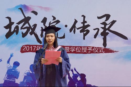 优秀毕业生代表,来自2014级土地资源管理专业的戴劲同学代表毕业生发言。她结合自己3年的研究生学习和生活,回顾在人生的最关键时期老师给予自己的教导和支持,表达对母校的深切感怀和依依眷恋,并将带着母校的希冀继续奔赴梦的远方。