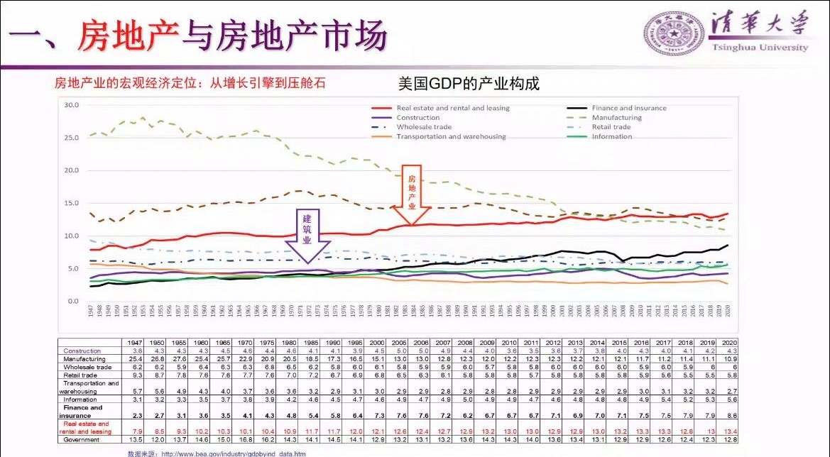 刘洪玉教授首先从我们为何要高度关注房地产业出发,通过数据列举了房地产在发达国家的重要地位,例如在美国GDP中占比16%、就业市场中占比3%、在社会财富中占比达到27%等,引发了学生对房地产业极大的关注和兴趣。并且重点阐述了房地产业与国民经济的关系,以美国房地产业为例,自1947年~2021年房地产业对美国GDP的贡献率持续攀升,根据NAHB的数据,仅住房服务和消费就对GDP的贡献作用已经达到16.8%,对比目前我国房地产业在GDP中的占比,指明我国未来房地产业仍有漫长的发展道路。而且房地产行业不仅为社会创造了巨大的财富,并且与人民的福祉,社会的进步息息相关。