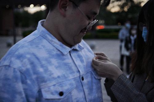 活动第第二部分,重温入团仪式。在校本部西门的初心广场“不忘初心”彩车前,学院分团委带领广大团员重温了入团仪式,并为今年新发展团员佩戴了团徽。新老团员一同奏唱嘹亮的国歌,重温了入团的庄严誓词,新老团员代表分别发言,老团员为新团员佩戴团徽。仪式在充满朝气的团歌中结束。