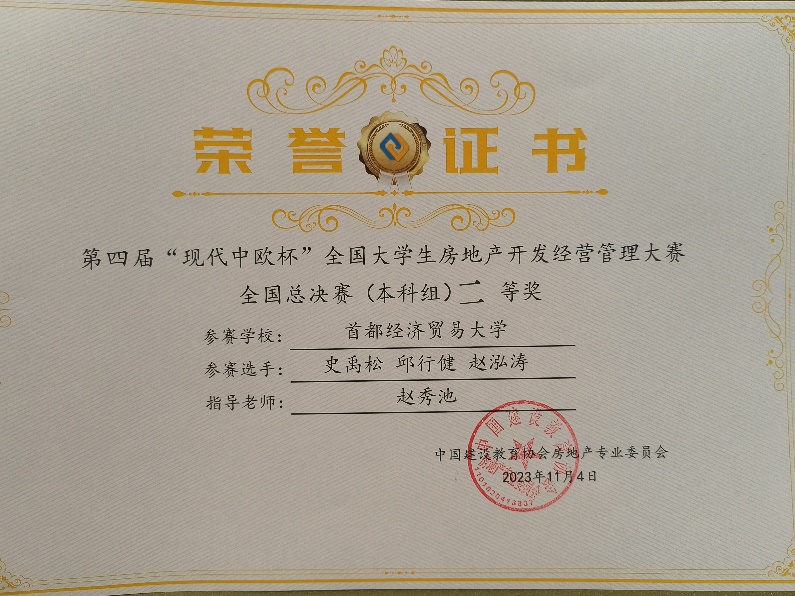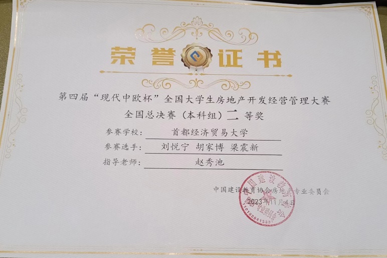 2023年11月5日,“第四届现代中欧杯全国大学生房地产开发经营管理大赛”全国总决赛在广东建设职业技术学院清远校区举办。本次大赛由中国建设教育协会指导、中国建设教育协会房地产专业委员会主办、广东建院和北京现代中欧软件开发有限公司联合承办。大赛坚持以赛促学、以赛促教、以赛促改、以赛促建,旨在提高大学生的房地产经营和管理能力,推动房地产行业的改革发展和技术进步,为房地产企业培养和发现高素质、高技能人才。本次大赛共有34高校、76支队伍到现场参加了总决赛,全程采取计算机网上比赛。我院3个团队均获得了全国二等奖,赵秀池教授获得了优秀指导教师称号。